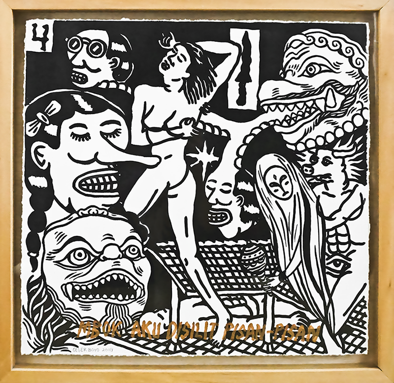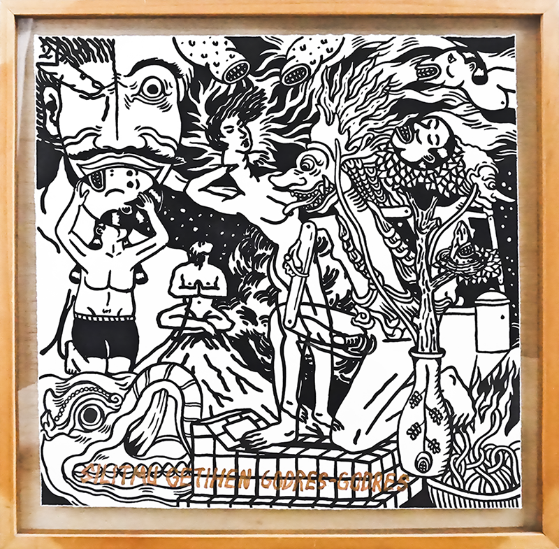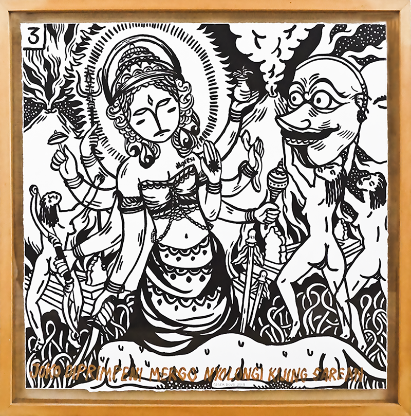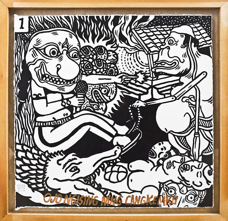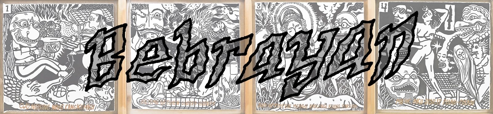 BEBRAYAN, which translates to ‘family’ or ‘living together’ in Indonesian, is understood by us as living collectively or in groups. This spirit is what we embody in running the GEGERBOYO collective. We started this collective in 2017 with the common ground of viewing Javanese culture through a more contemporary and modern lens. BEBRAYAN is the spirit that drives us in GEGERBOYO. We consciously set aside time to gather together and draw collectively with a spirit of togetherness. The four works we create do not go through a sketching process beforehand; instead, they respond to each other. This is our experiment in understanding how to interact within a collective. Speaking through images.