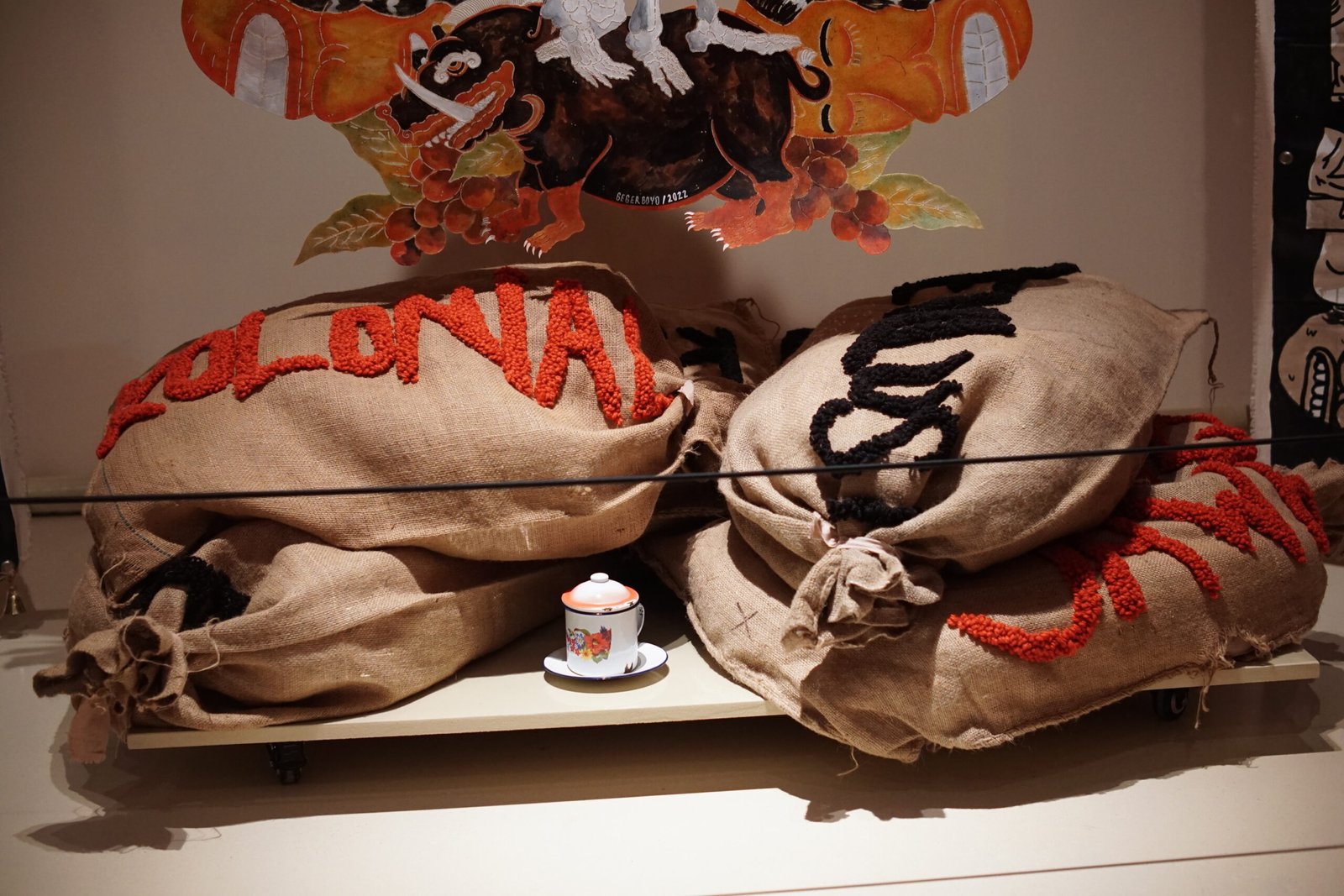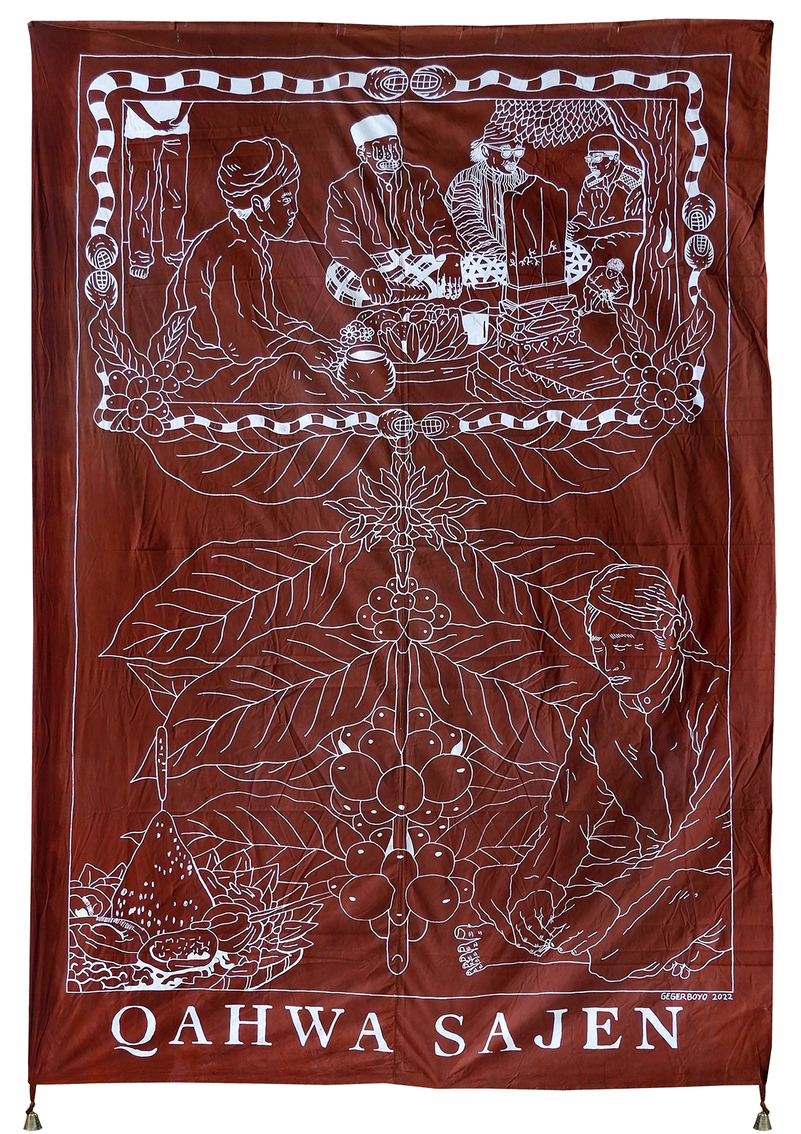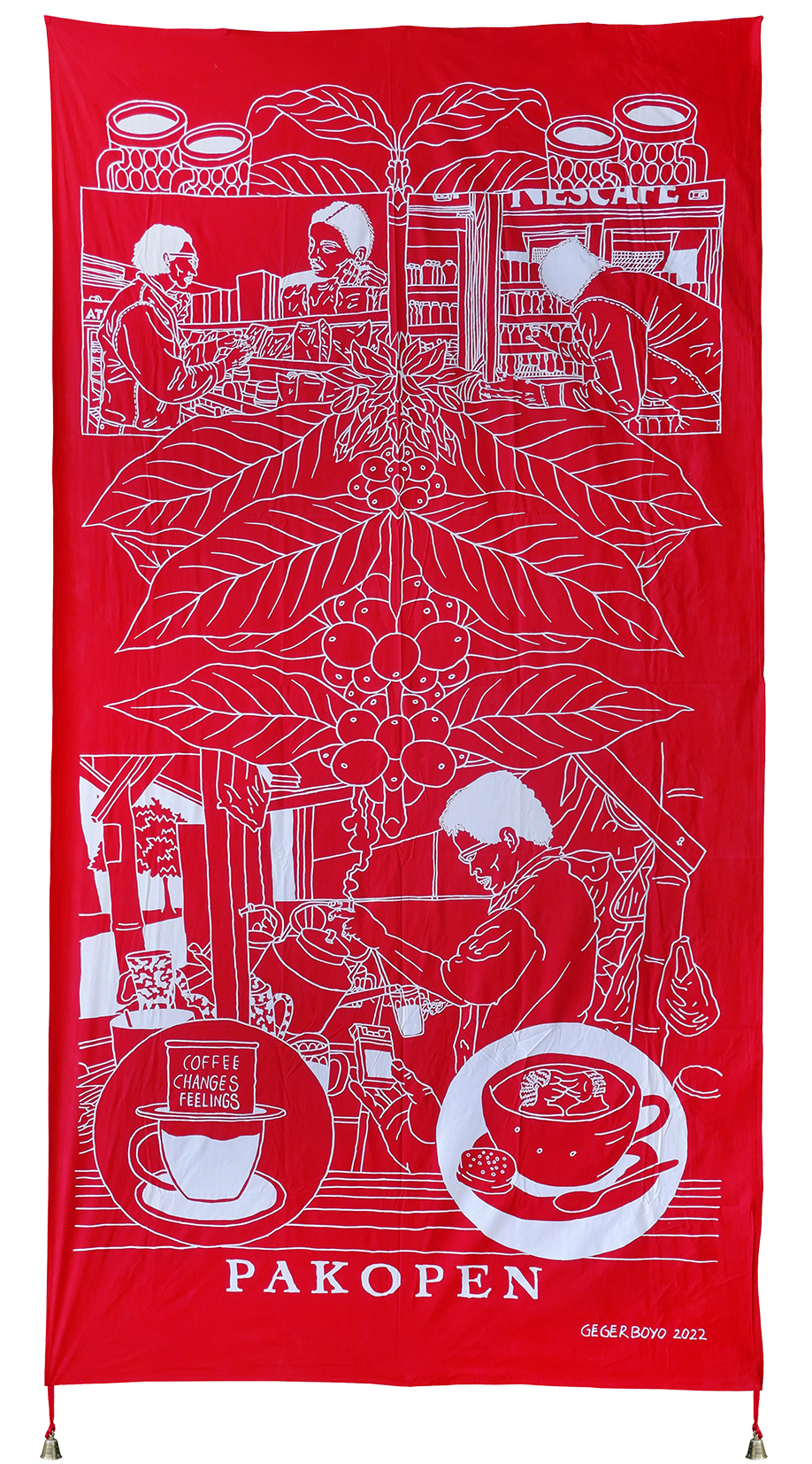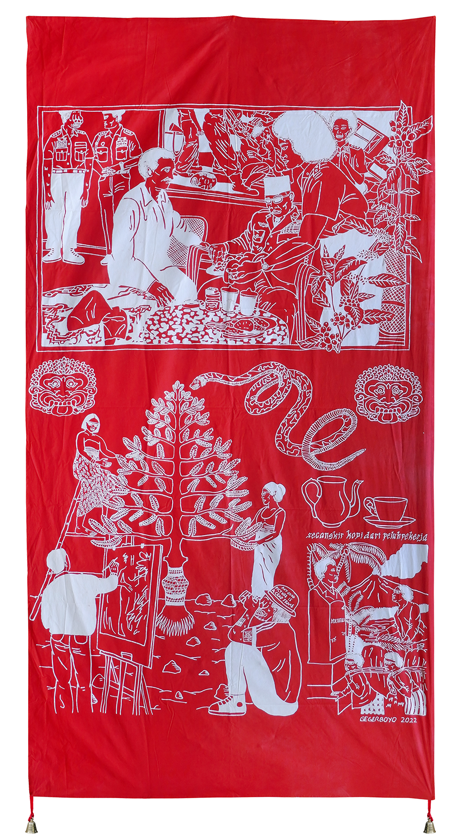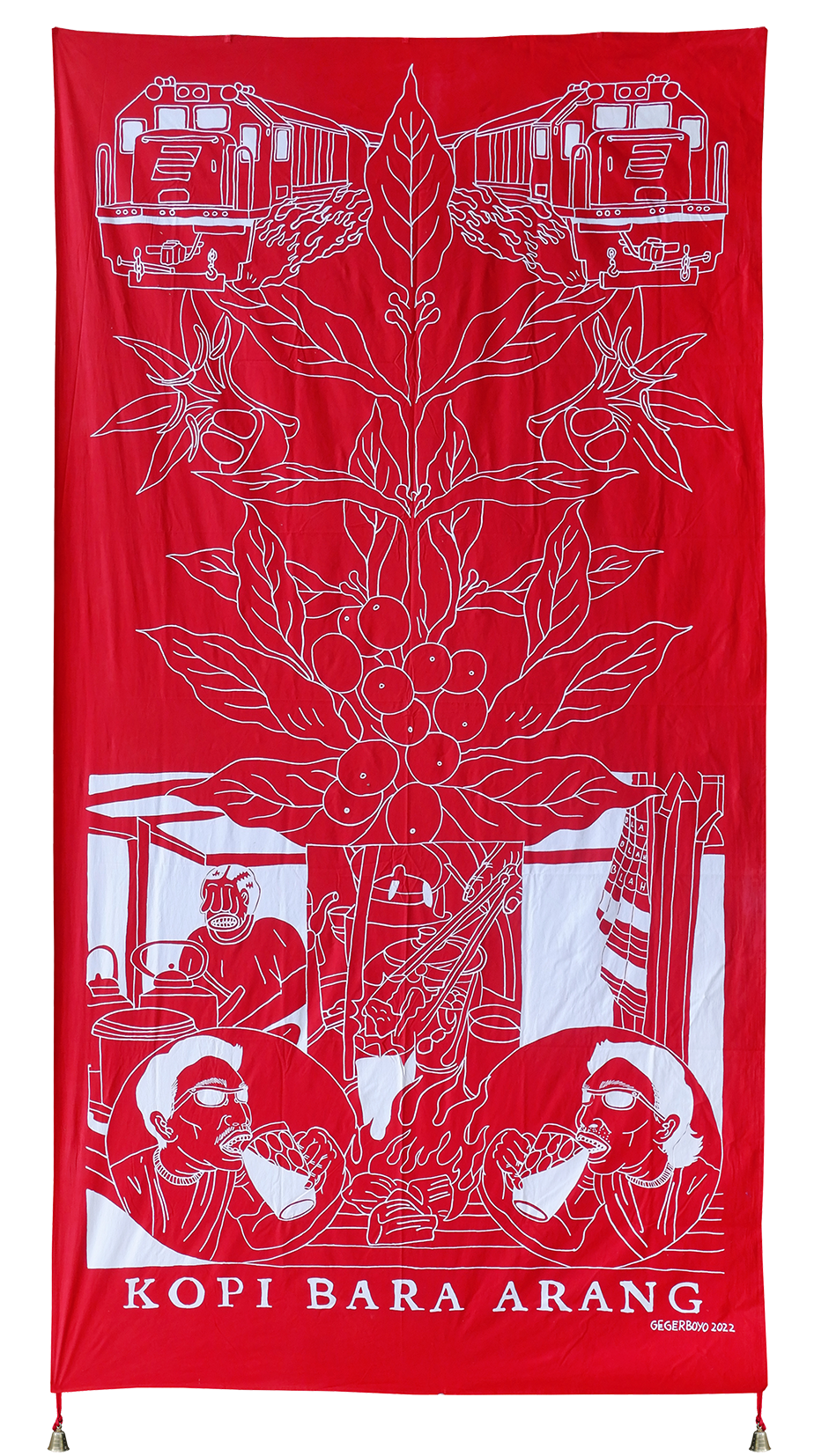 Each piece of Gegerboyo’s work tells of one story and the circumstances in which the coffee is written is at. The bell hanging on each piece is a symbol of time. Broadly speaking, Gegerboyo’s work discusses about track record and journey of the coffee plant with all its intrigue, from myths, history, to modern life.