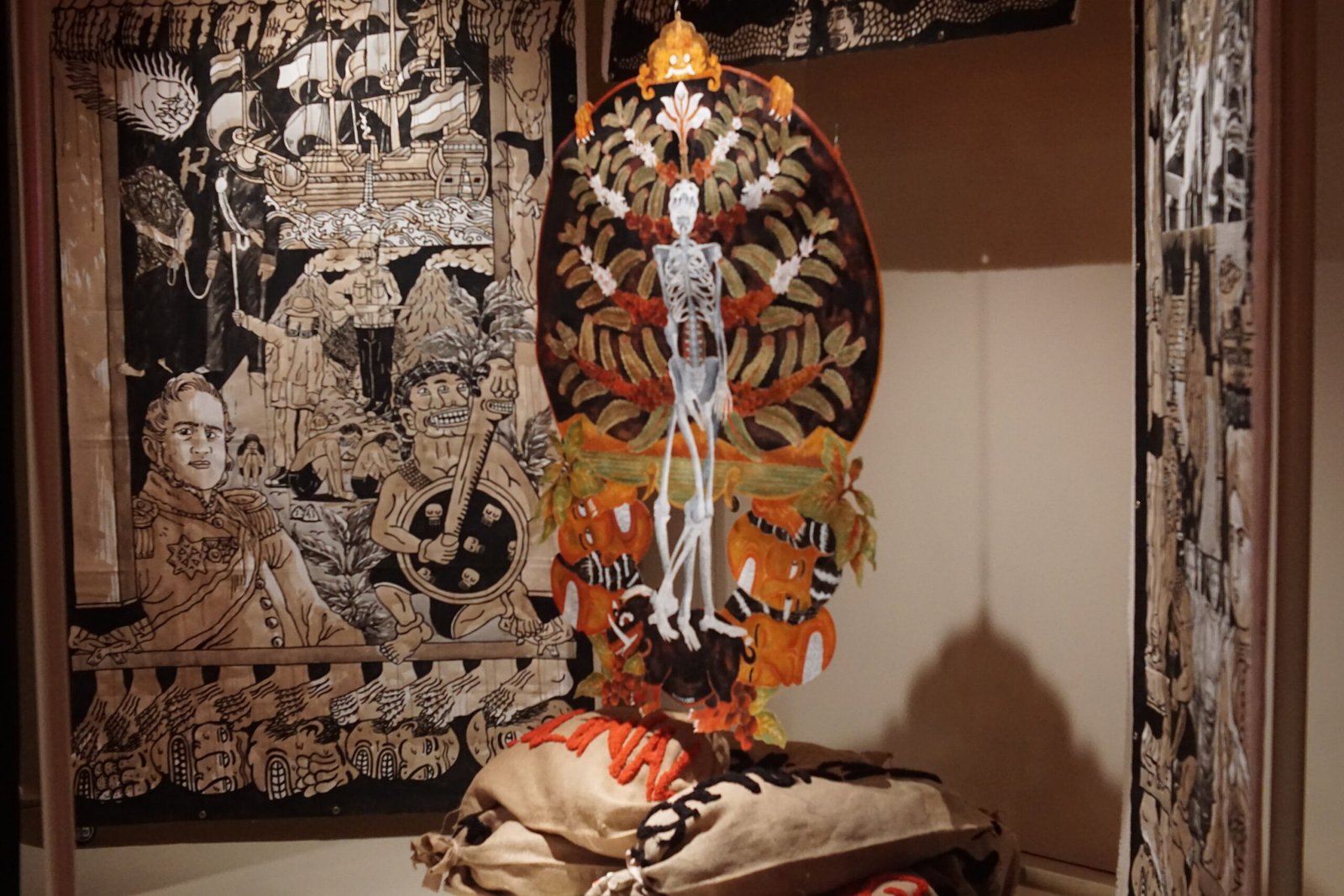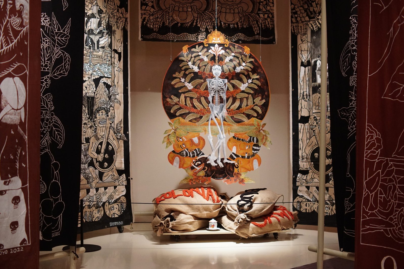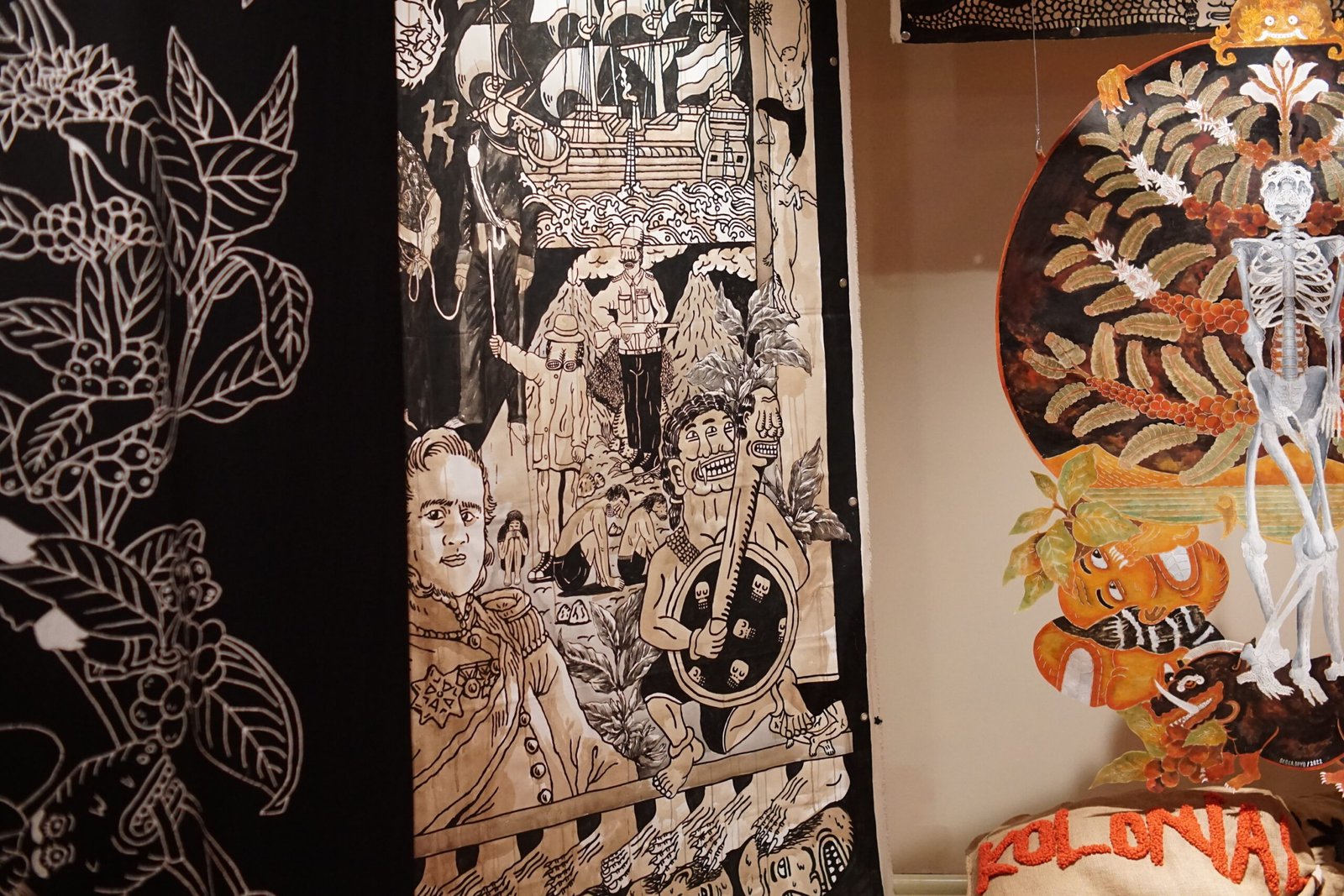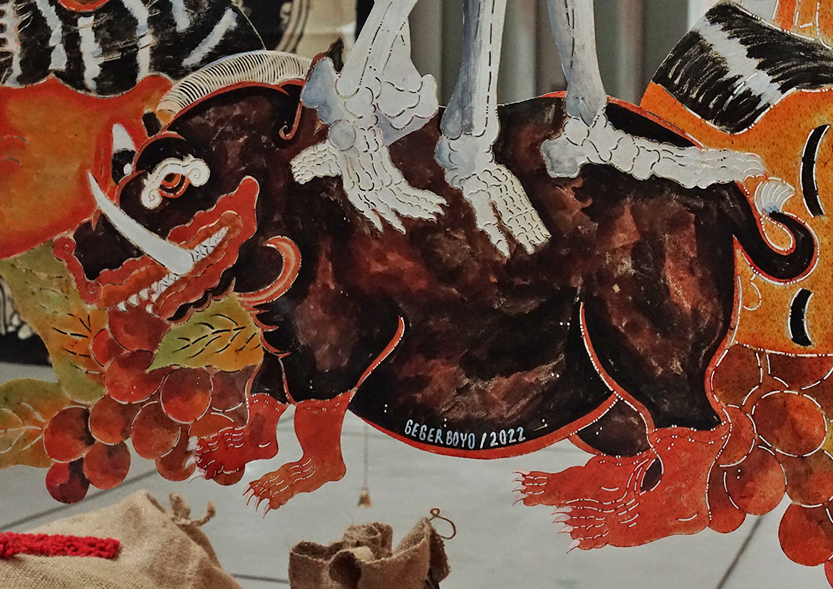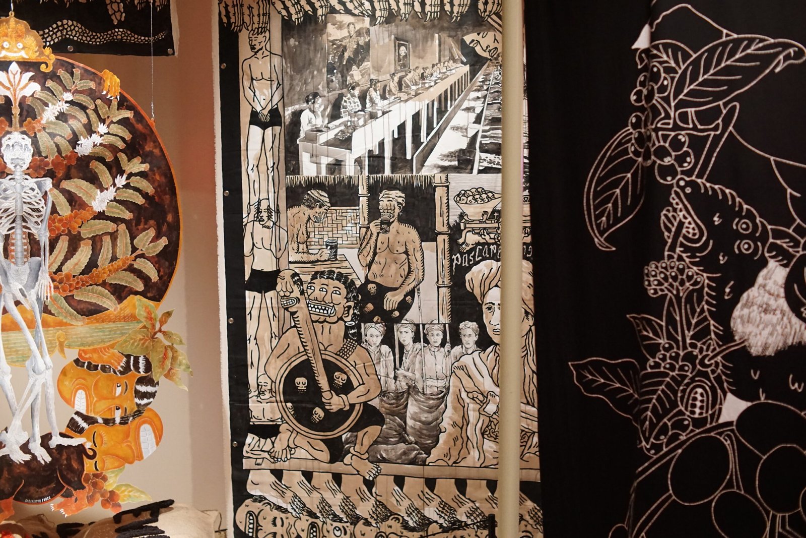 Batik on cloth, painting on canvas, shadow puppets, goni sacks