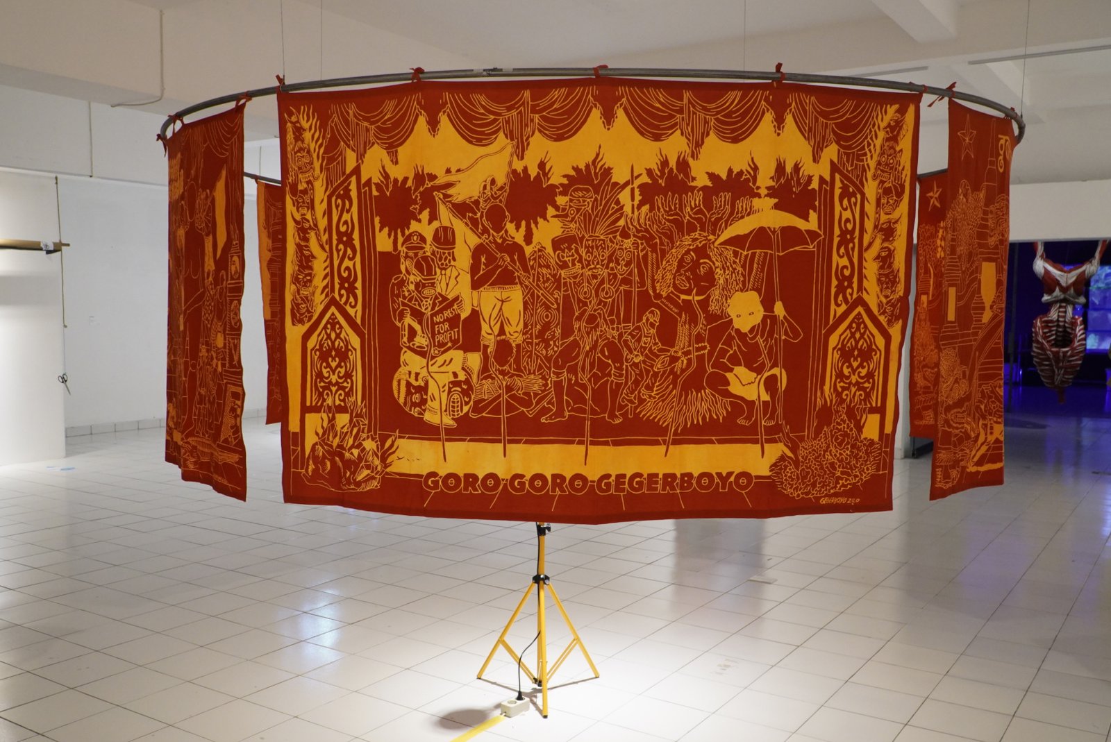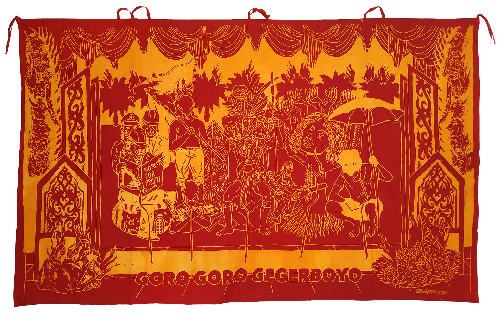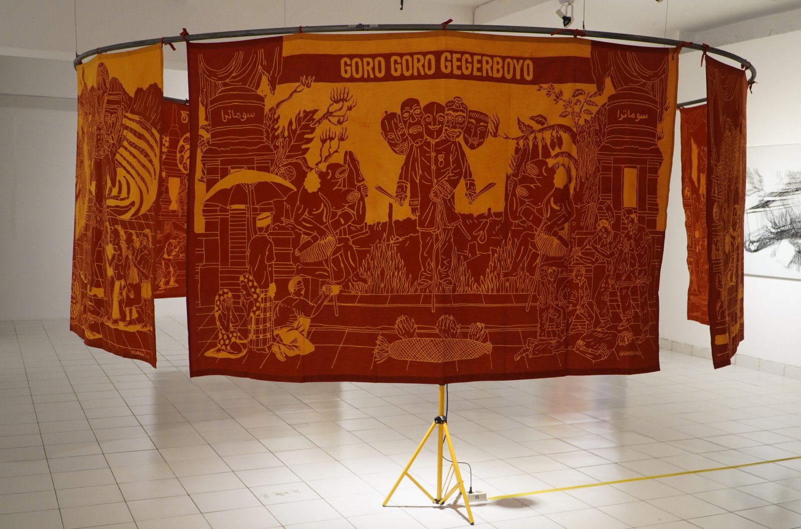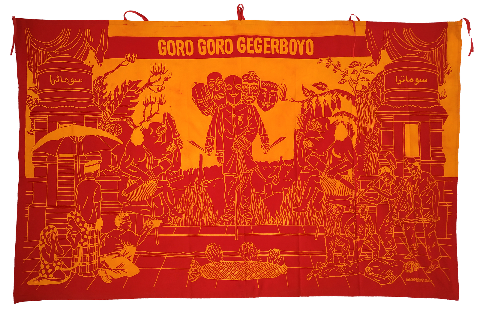It is a batik series from Gegerboyo called “Tonil Goro Goro” that tells about environmental destruction on several islands in Indonesia. In traditional shadow puppetry (wayang kulit, purwa), the scene of “goro goro” is always included as part of the storyline. It begins with the manifestation of human vices leading to chaos everywhere. The “Tonil Batik Goro Goro Gegerboyo” is a record of the chaos that has occurred and is ongoing in Indonesia. Stories about corrupt government officials, deforestation, environmental destruction, unfair preferences, social inequalities, and human vices are vividly depicted in the “Tonil Batik Goro Goro Gegerboyo”.
