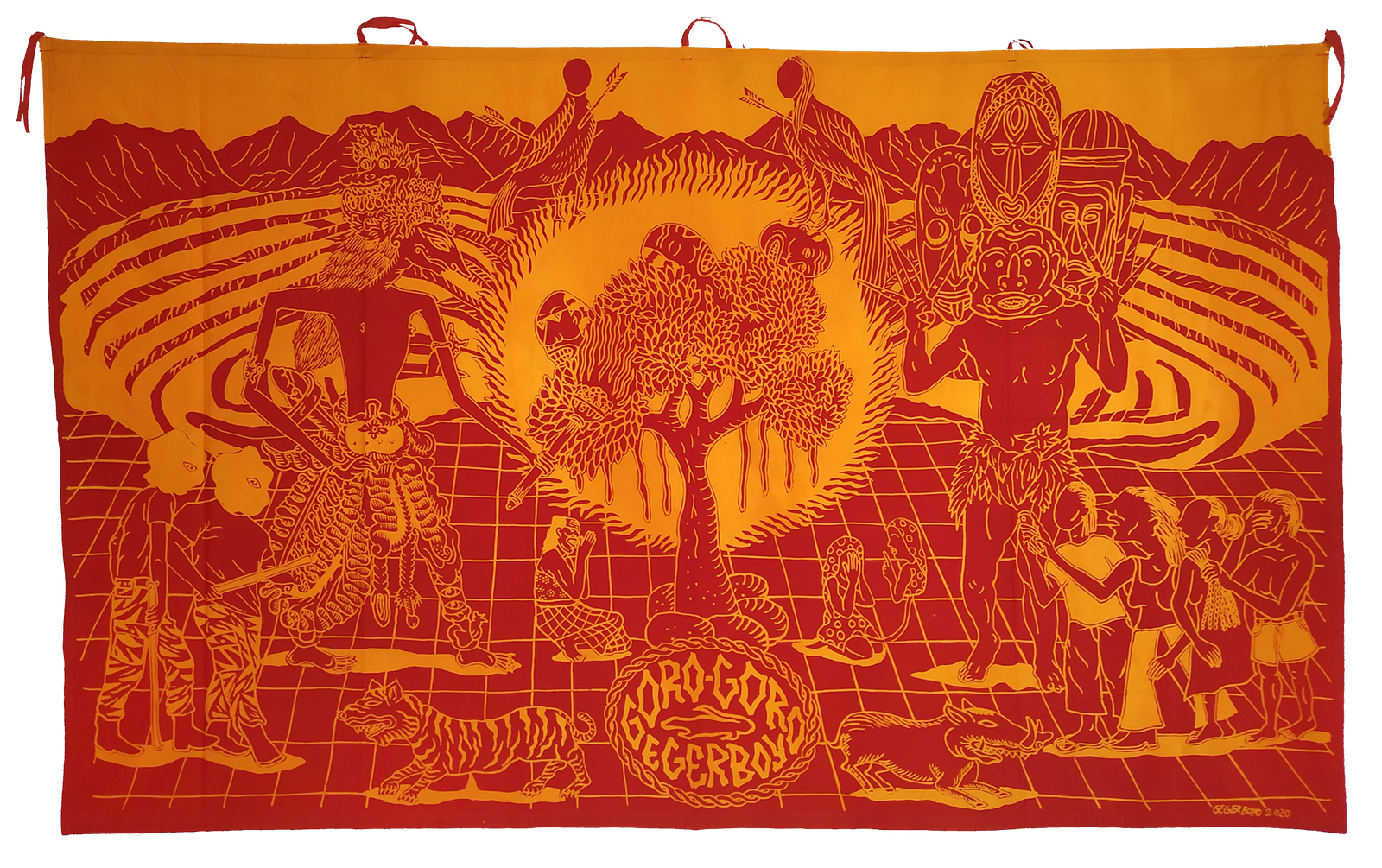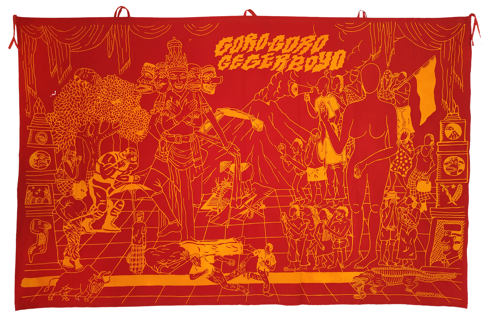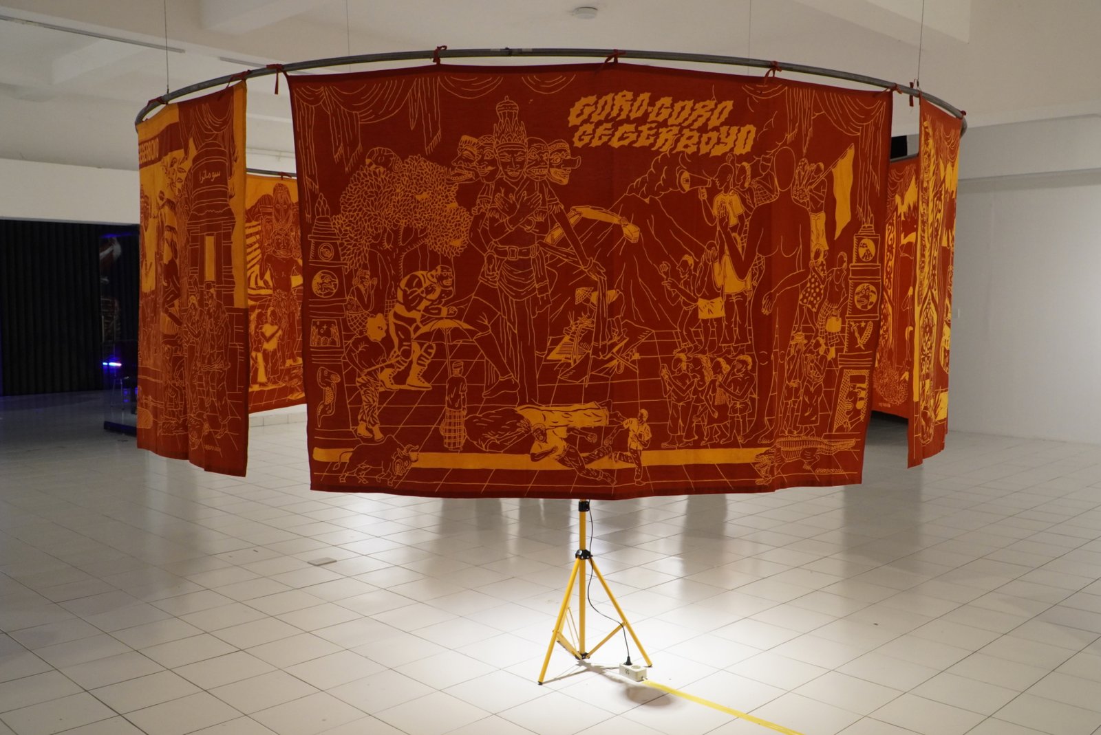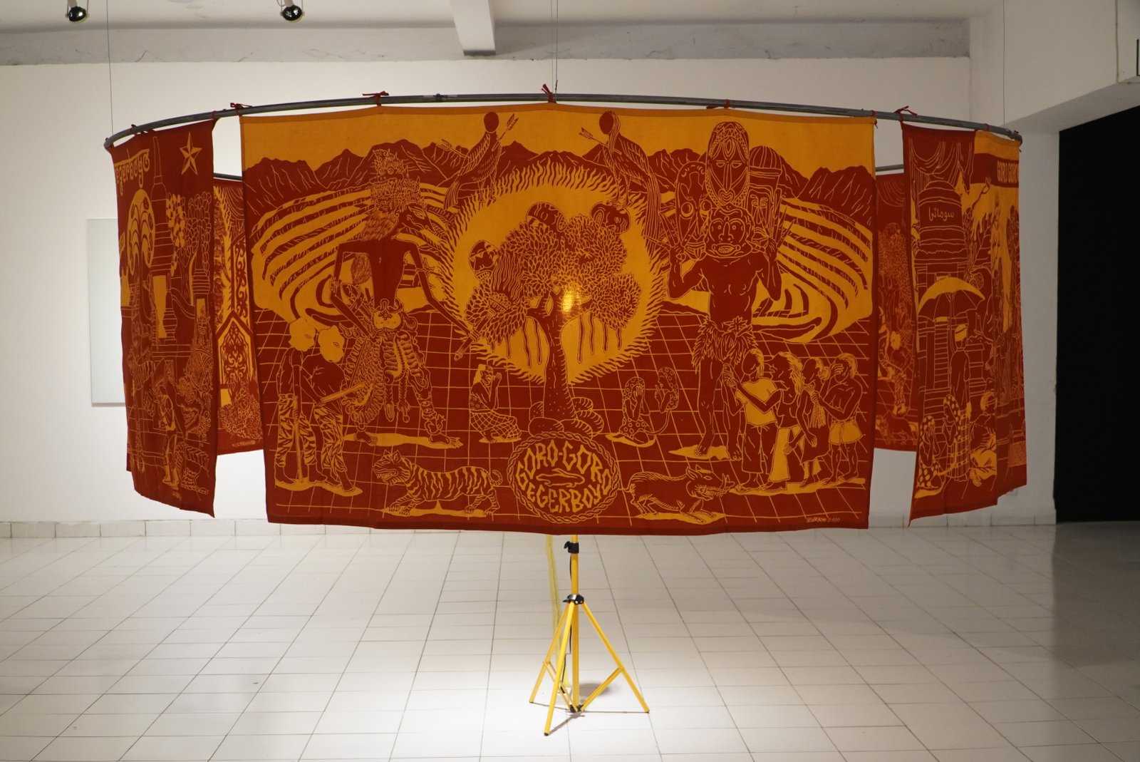 It is a batik series from Gegerboyo called “Tonil Goro Goro” that tells about environmental destruction on several islands in Indonesia. In traditional shadow puppetry (wayang kulit, purwa), the scene of “goro goro” is always included as part of the storyline. It begins with the manifestation of human vices leading to chaos everywhere. The “Tonil Batik Goro Goro Gegerboyo” is a record of the chaos that has occurred and is ongoing in Indonesia. Stories about corrupt government officials, deforestation, environmental destruction, unfair preferences, social inequalities, and human vices are vividly depicted in the “Tonil Batik Goro Goro Gegerboyo”.