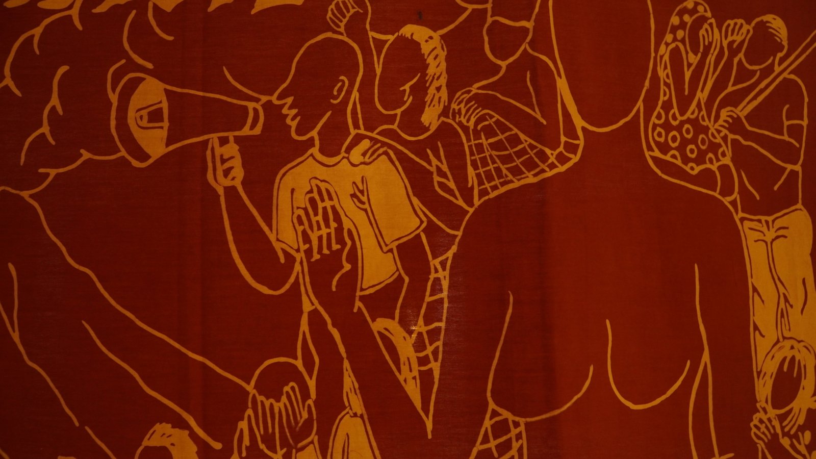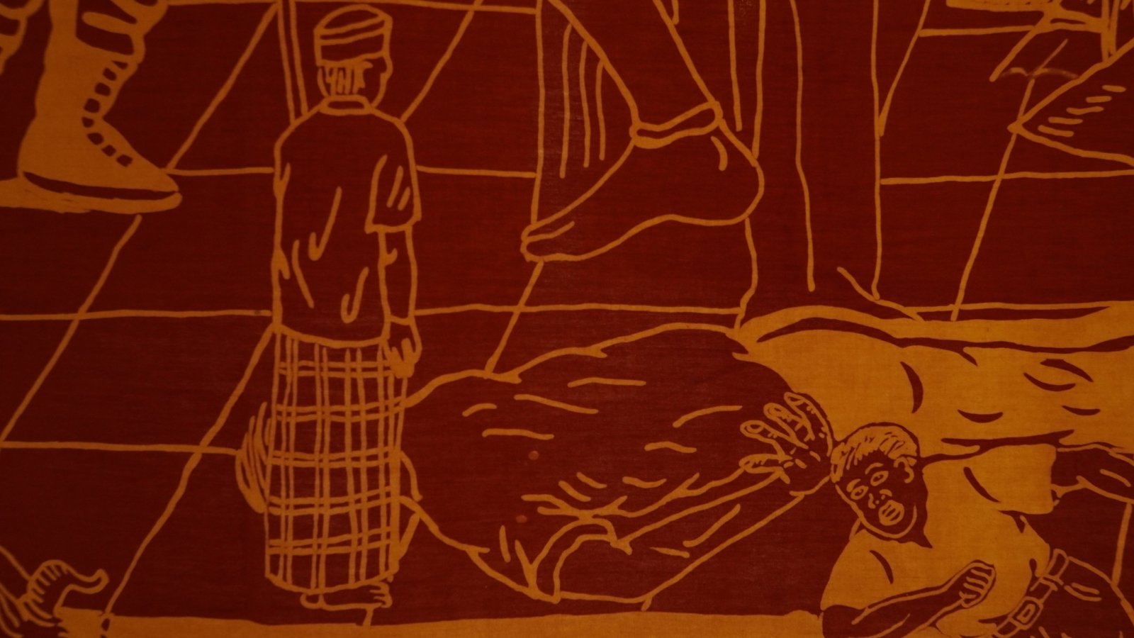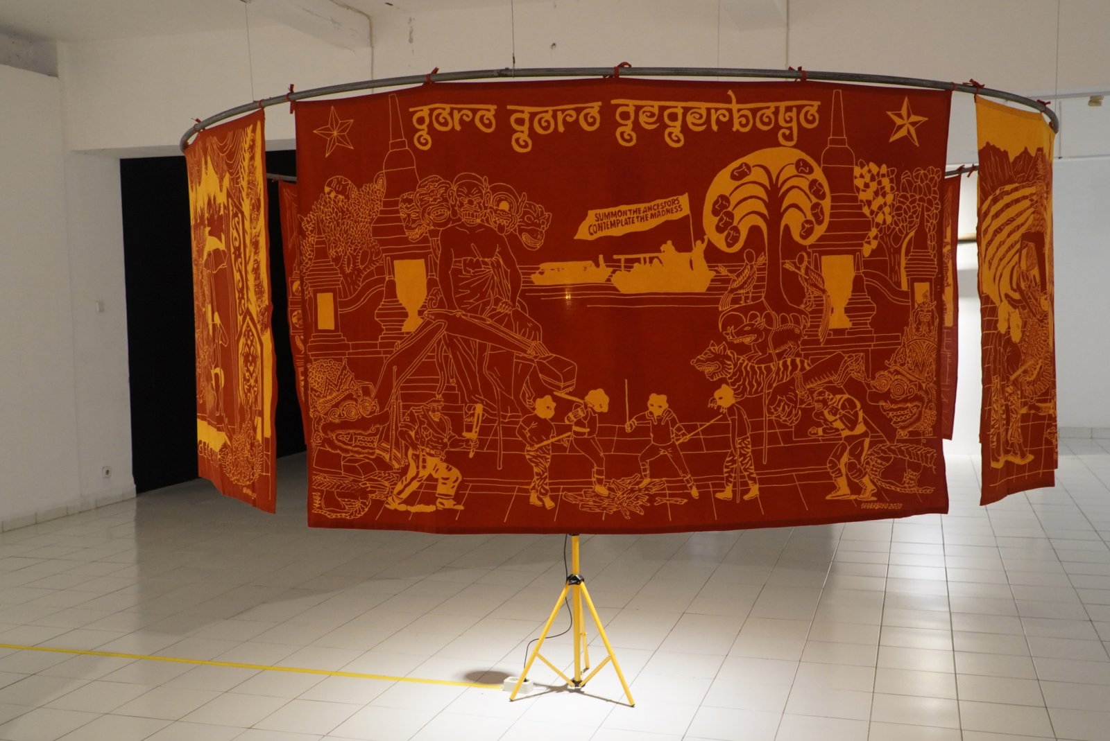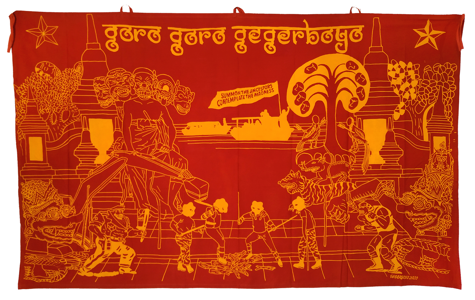 It is a batik series from Gegerboyo called “Tonil Goro Goro” that tells about environmental destruction on several islands in Indonesia. In traditional shadow puppetry (wayang kulit, purwa), the scene of “goro goro” is always included as part of the storyline. It begins with the manifestation of human vices leading to chaos everywhere. The “Tonil Batik Goro Goro Gegerboyo” is a record of the chaos that has occurred and is ongoing in Indonesia. Stories about corrupt government officials, deforestation, environmental destruction, unfair preferences, social inequalities, and human vices are vividly depicted in the “Tonil Batik Goro Goro Gegerboyo”.