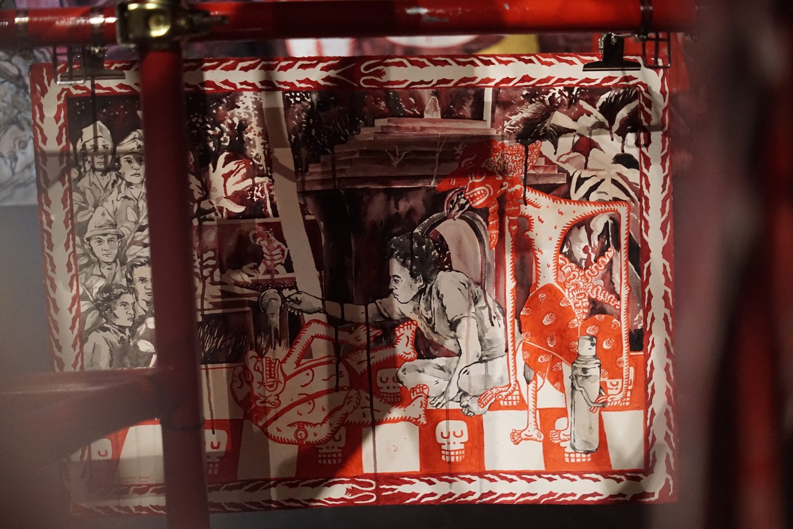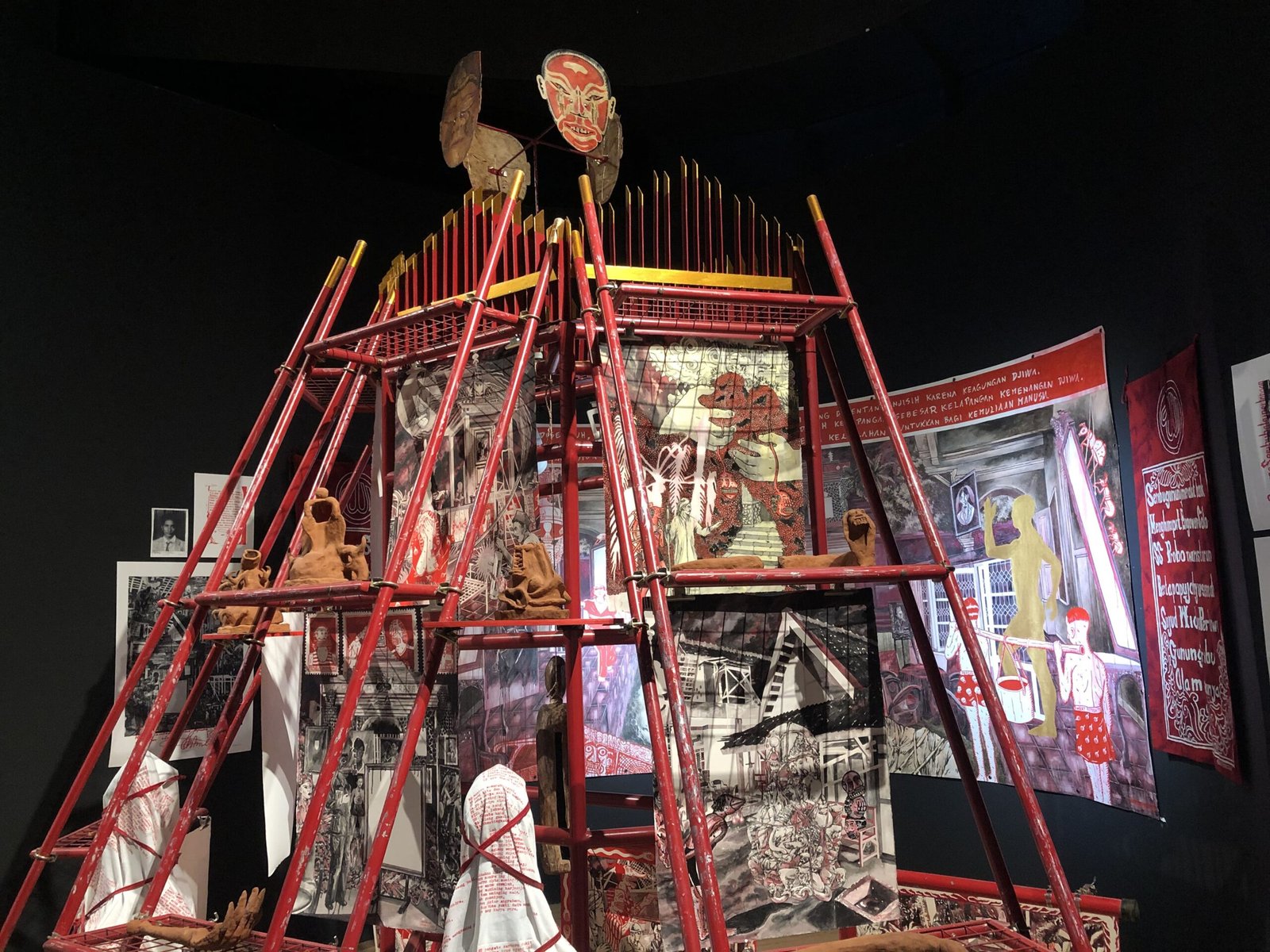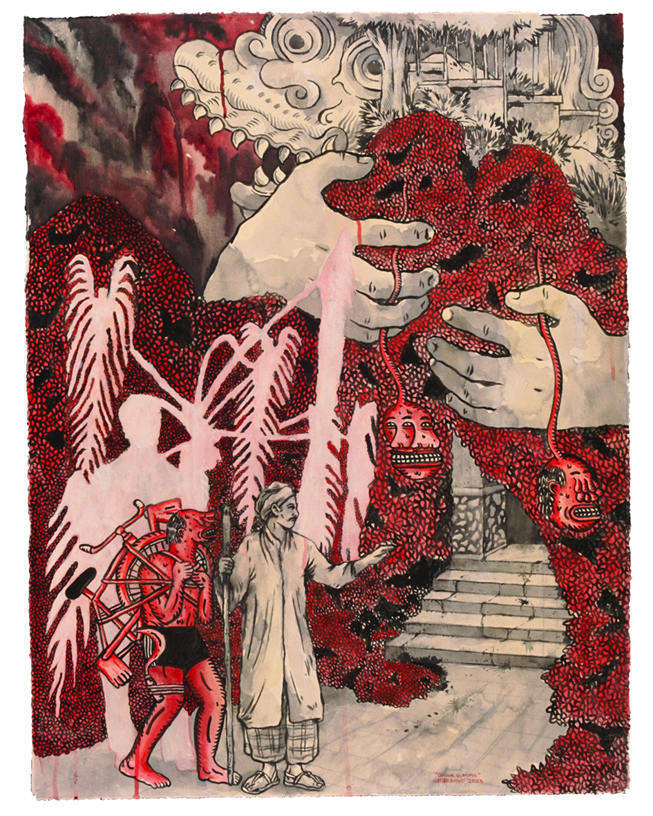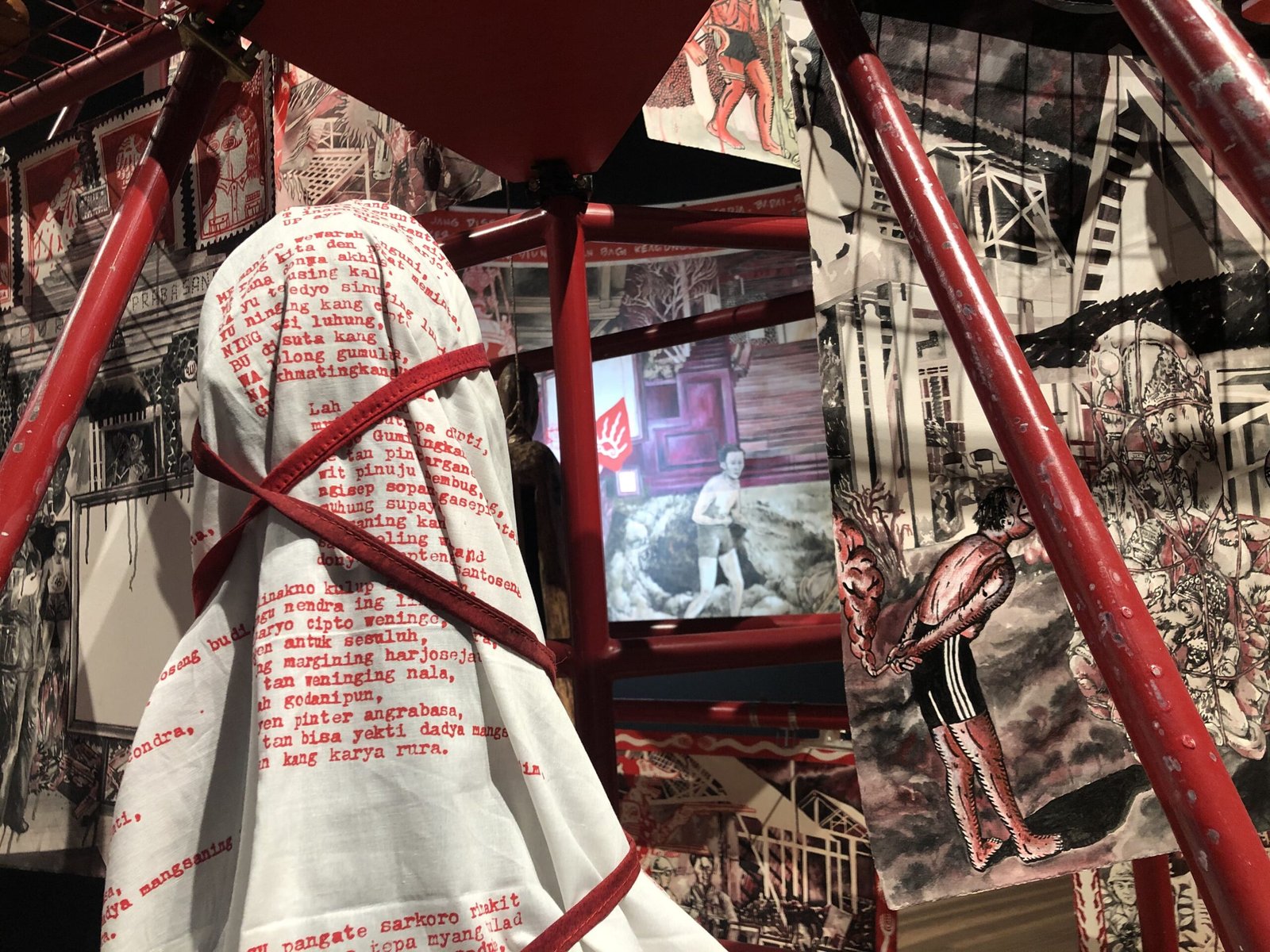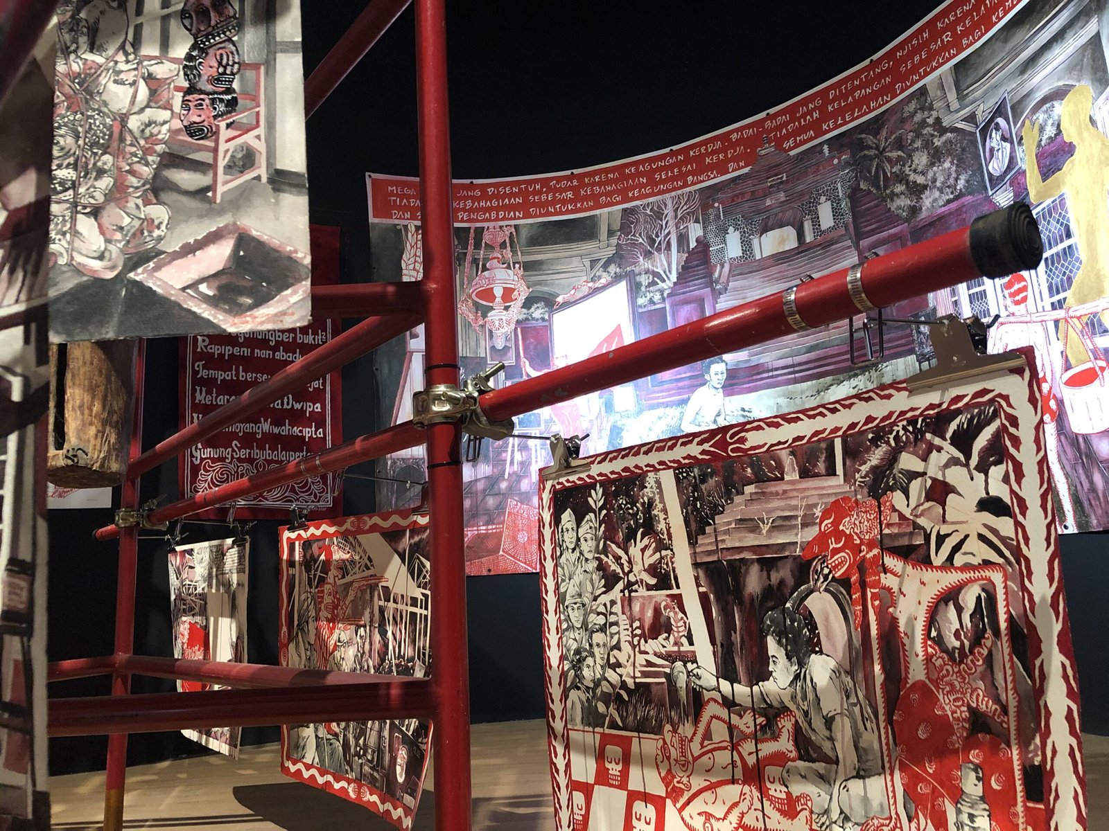 This group of young artists is interested in mythology and mystical sites that are sacred in Java. Their installation works at ARTJOG was based on research on a pilgrimage site which local community named Gunung Hargo Gumilang or Gunung Tutup in Ponjong, Gunungkidul, Yogyakarta. Their interest in this trail was sparked by a story about the role of a figure in Indonesian politics named Sukino Suprobo. Mr. Kino is known to have supernatural power and healing power, earned the nickname “a man who cares for a mountain” and during his life  timewas close to the figure of President Soekarno. This figure is also a promoter for traditional Javanese art. This memorial is sacred because apart from Mr. Kino, there is also a grave of Eyang Mangunkusumo, a direct descendant of Mangkunegara I or Prince Samber Nyawa who was known to be anti-colonial and a National Hero.