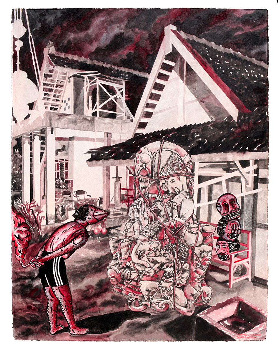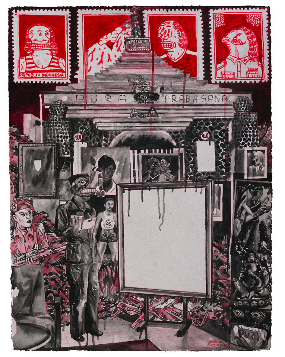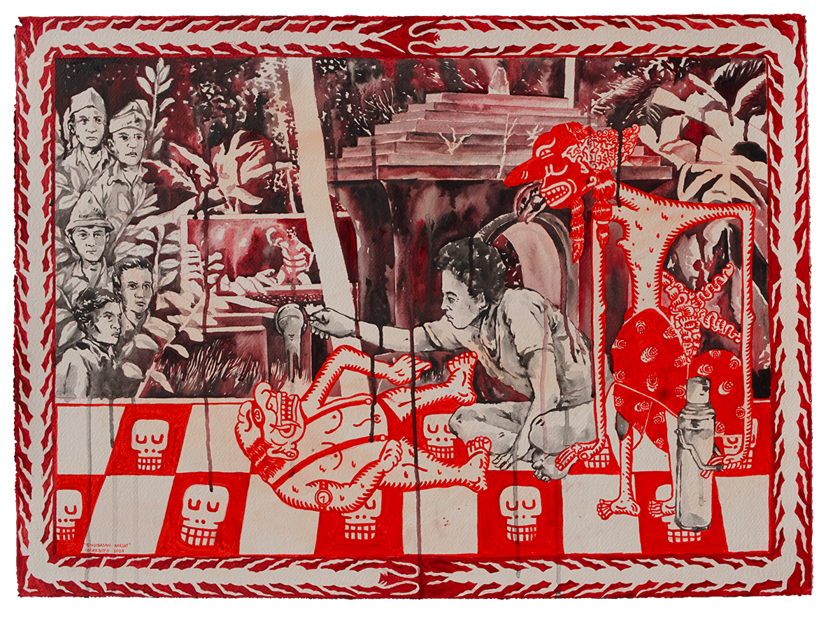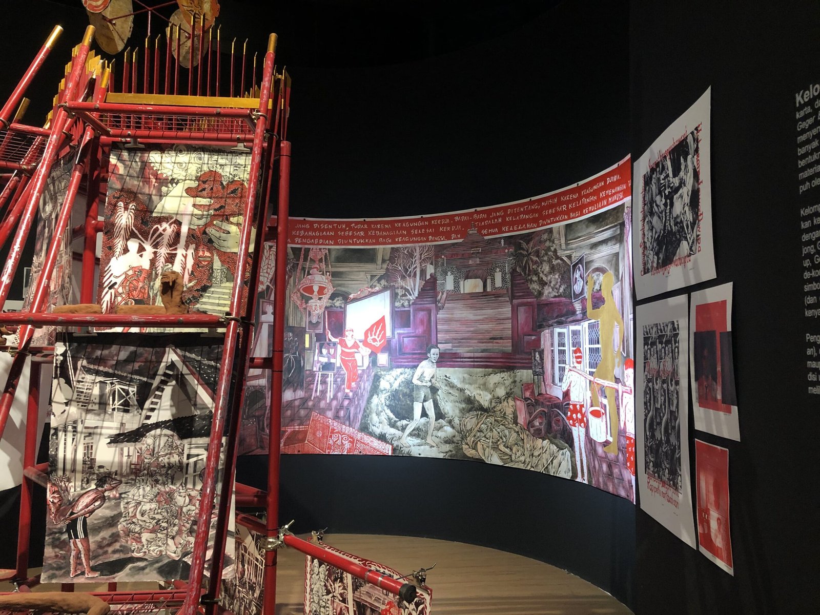 This group of young artists is interested in mythology and mystical sites that are sacred in Java. Their installation works at ARTJOG was based on research on a pilgrimage site which local community named Gunung Hargo Gumilang or Gunung Tutup in Ponjong, Gunungkidul, Yogyakarta. Their interest in this trail was sparked by a story about the role of a figure in Indonesian politics named Sukino Suprobo. Mr. Kino is known to have supernatural power and healing power, earned the nickname “a man who cares for a mountain” and during his life  timewas close to the figure of President Soekarno. This figure is also a promoter for traditional Javanese art. This memorial is sacred because apart from Mr. Kino, there is also a grave of Eyang Mangunkusumo, a direct descendant of Mangkunegara I or Prince Samber Nyawa who was known to be anti-colonial and a National Hero.