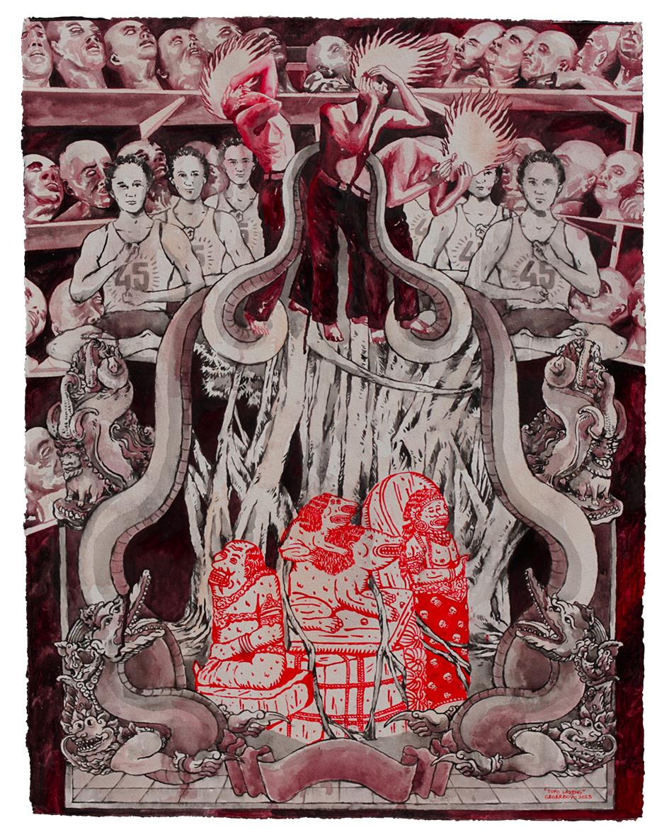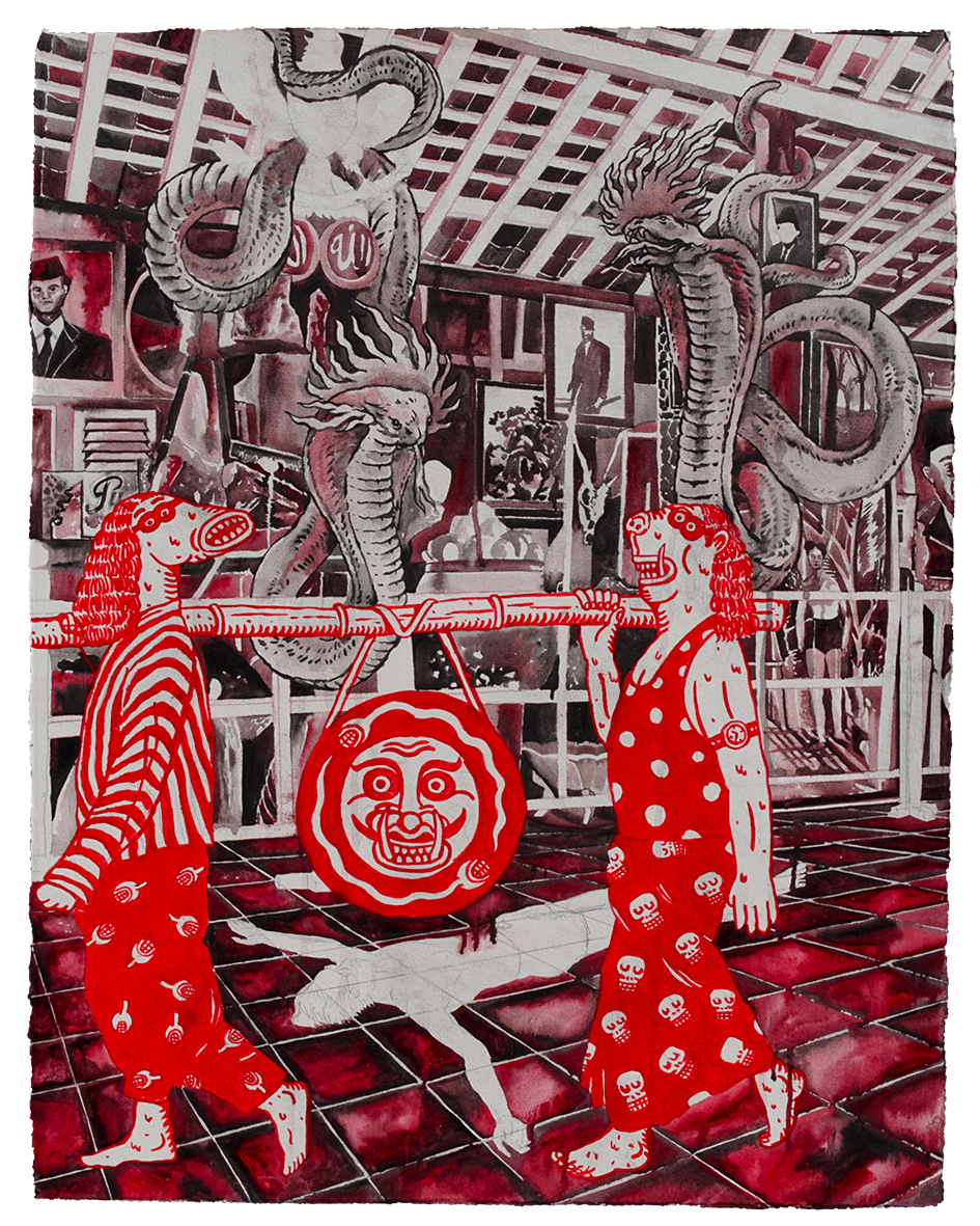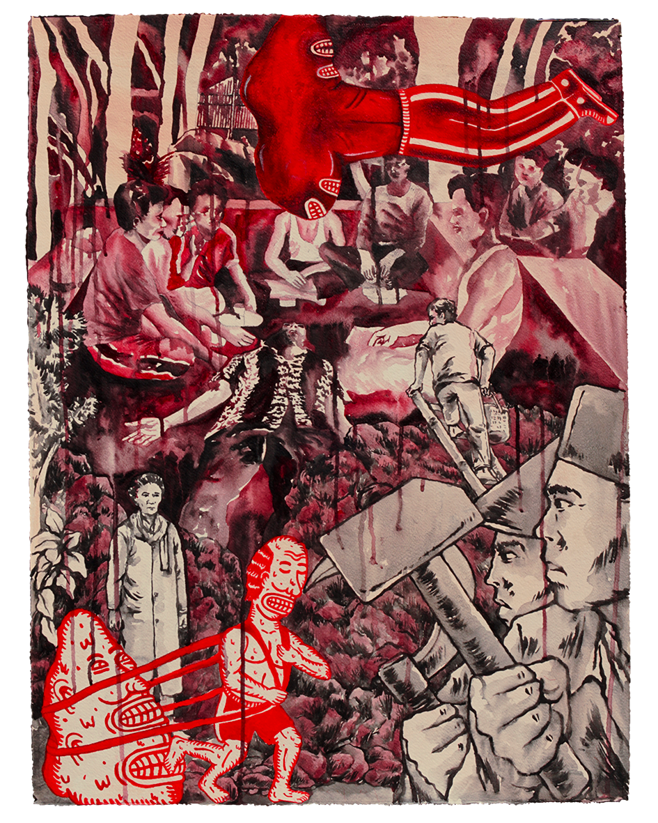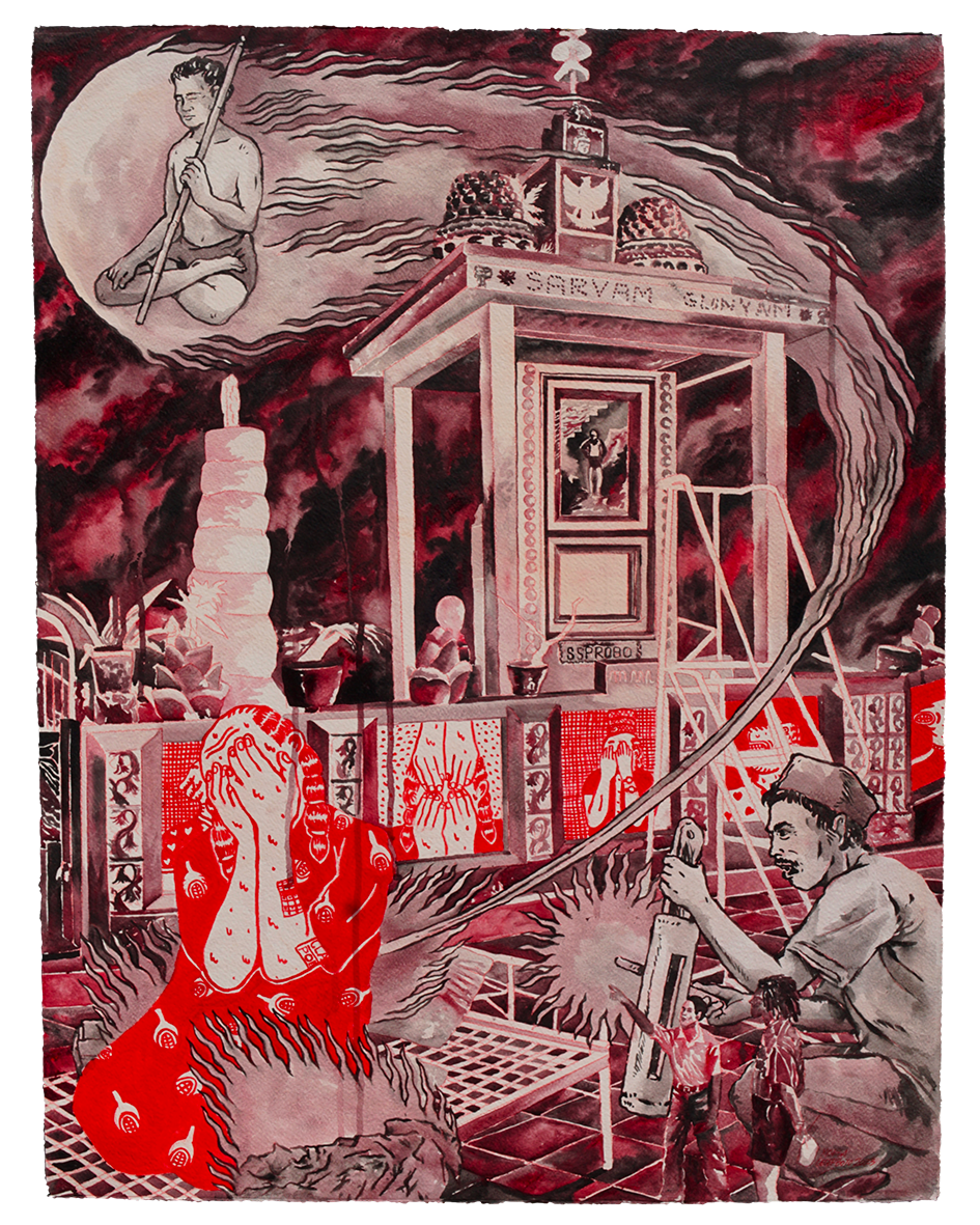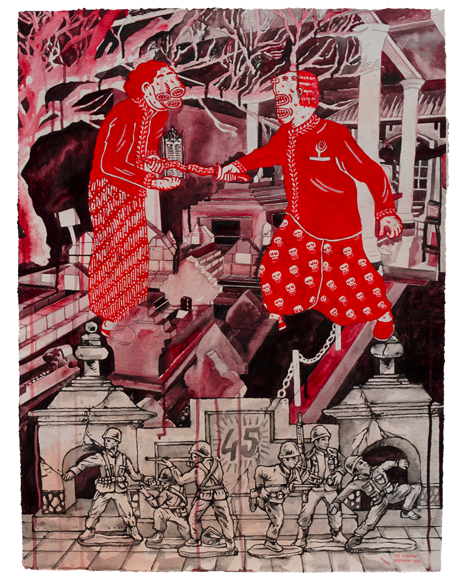 This group of young artists is interested in mythology and mystical sites that are sacred in Java. Their installation works at ARTJOG was based on research on a pilgrimage site which local community named Gunung Hargo Gumilang or Gunung Tutup in Ponjong, Gunungkidul, Yogyakarta. Their interest in this trail was sparked by a story about the role of a figure in Indonesian politics named Sukino Suprobo. Mr. Kino is known to have supernatural power and healing power, earned the nickname “a man who cares for a mountain” and during his life  timewas close to the figure of President Soekarno. This figure is also a promoter for traditional Javanese art. This memorial is sacred because apart from Mr. Kino, there is also a grave of Eyang Mangunkusumo, a direct descendant of Mangkunegara I or Prince Samber Nyawa who was known to be anti-colonial and a National Hero.