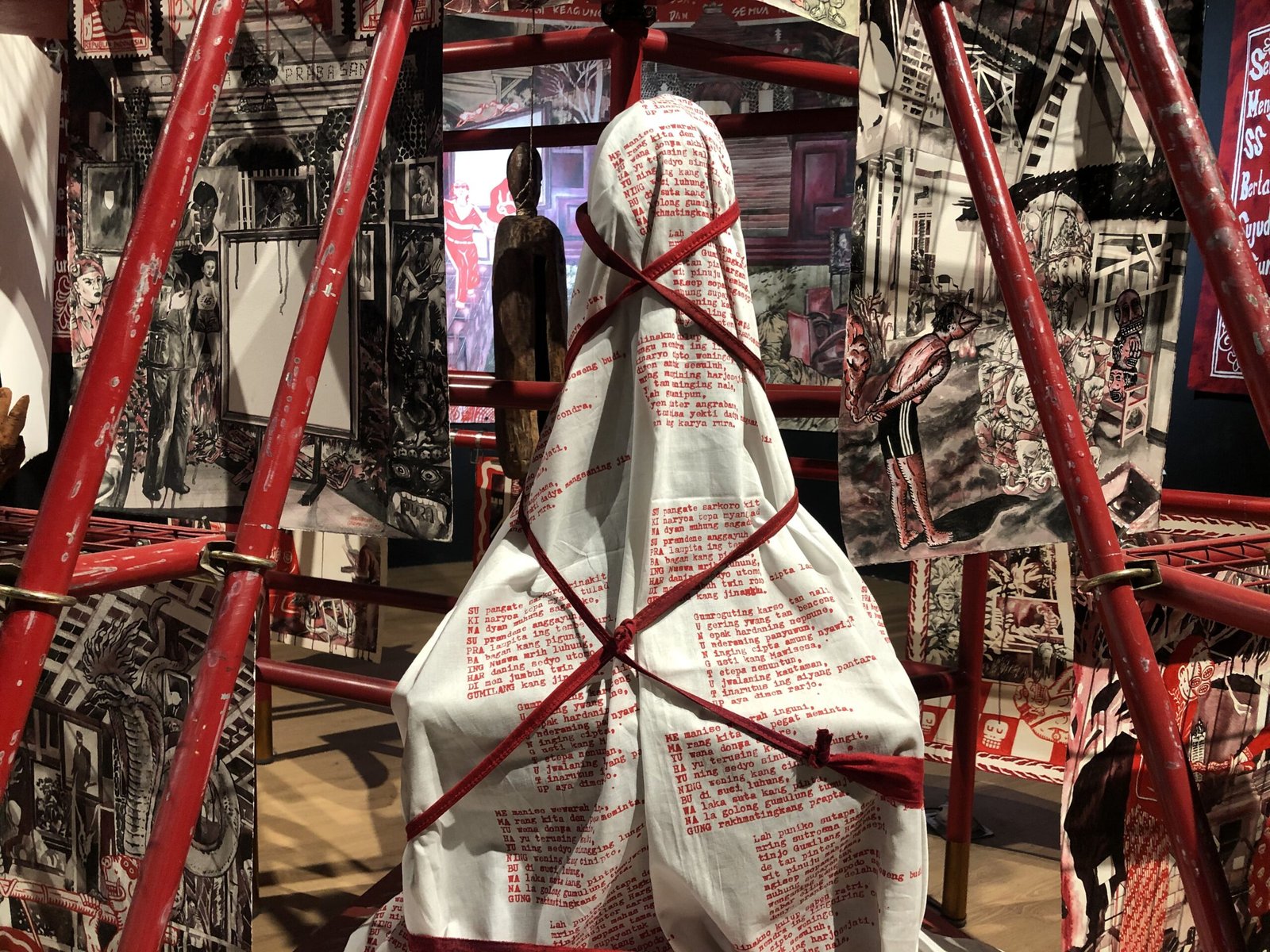 This installation works tries to bring back the forms, content and essence of the ruins of Gunung Tutup which was built on four principles, namely socialism (gotong-royong), nationalism, spiritualism and culture. This site is also known as the site of diversity or the site of Pancasila ideology because it was formed from a syncretic mixture of elements of Hinduism, Islamic background, Javanese culture and others. Gunung Tutup has also been interpreted by local community as “something that is covered up”. The visual aesthetic motif developed by Gegerboyo group is characterized by “obar-abir”, “tumpuk-tundung” and “uba rampe”, all of which refer to the richness and unity of various elements in the ritual tradition.