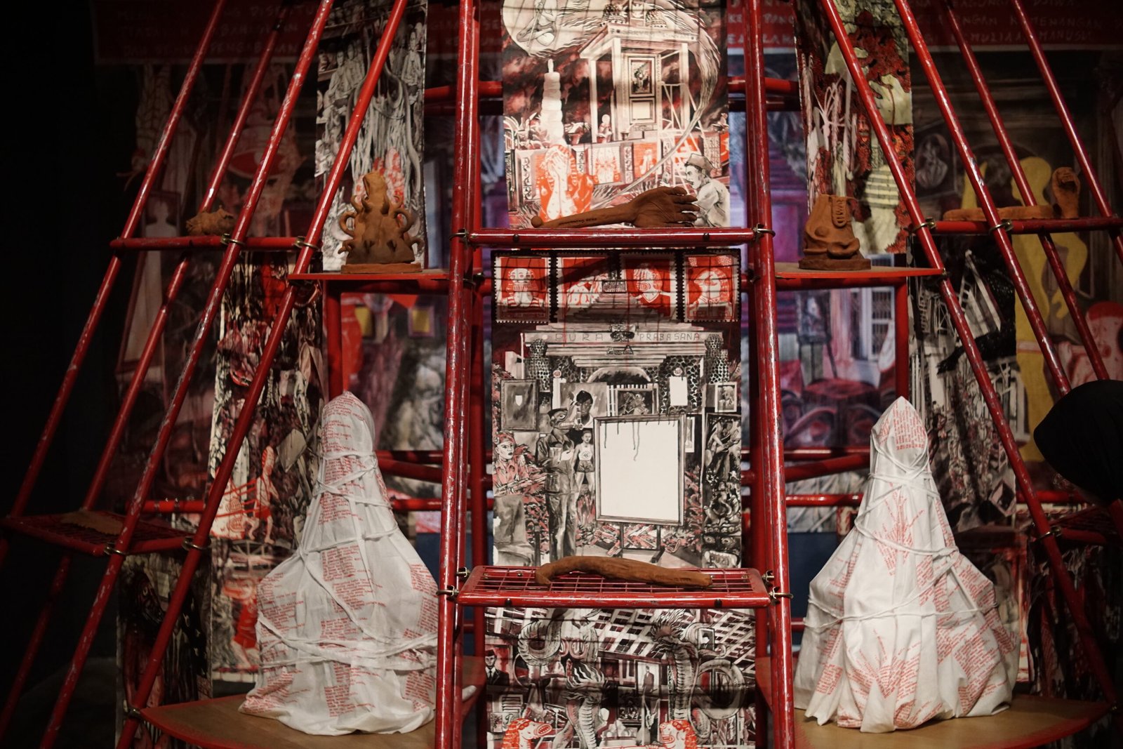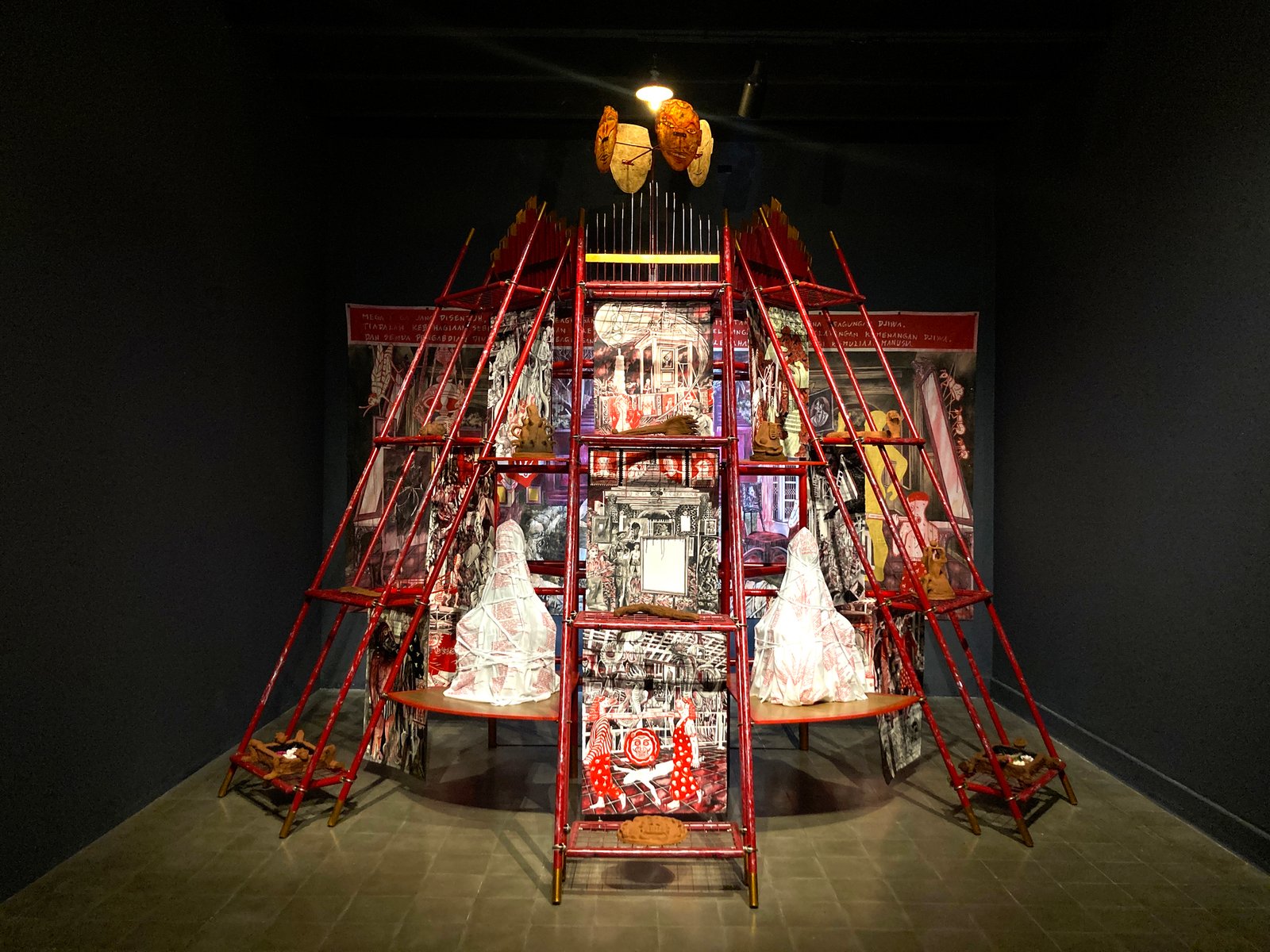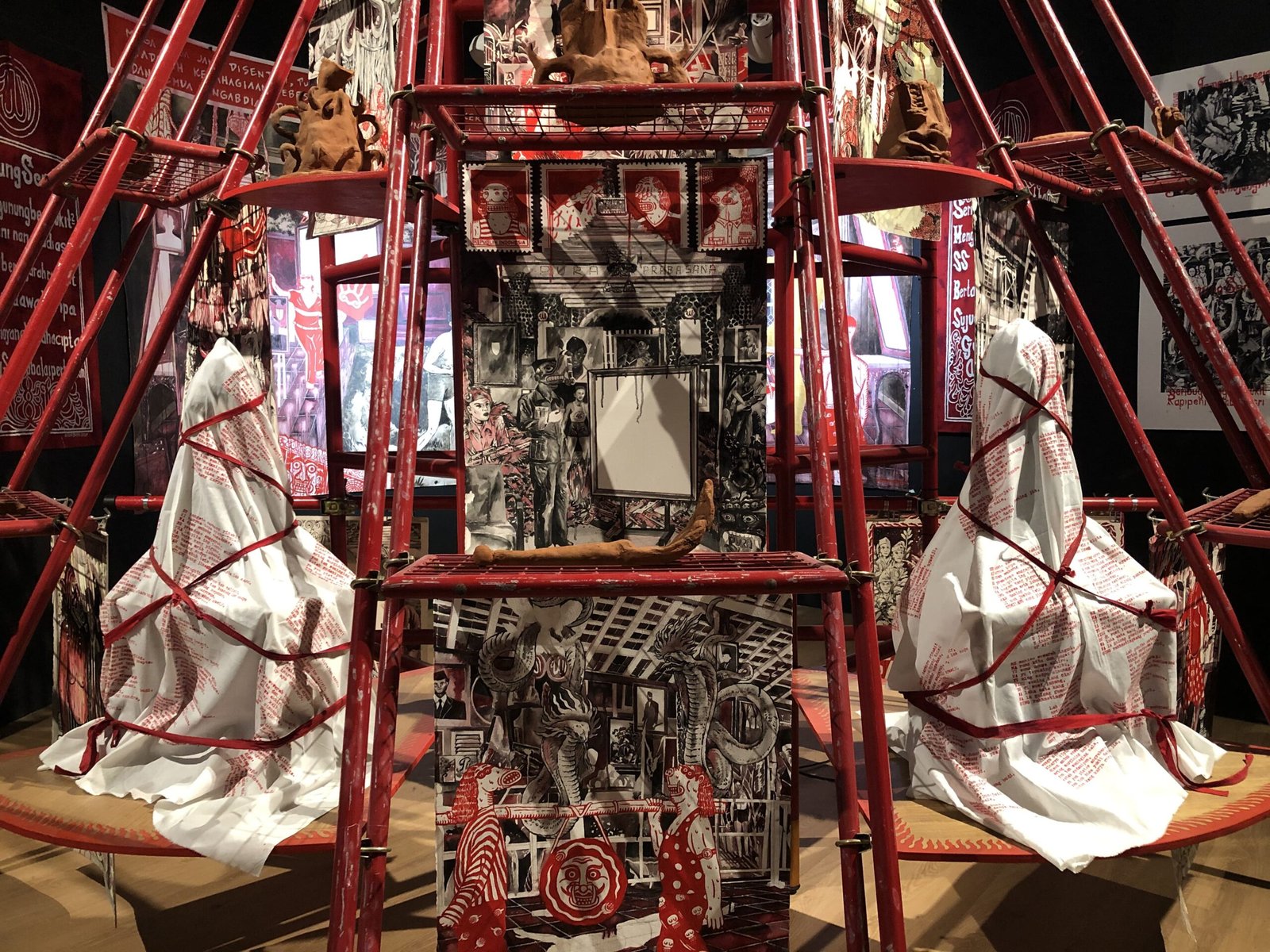 Painting on canvas and paper, shadow puppet mask, terracotta, silkscreen on fabric, found objects and steel installation
