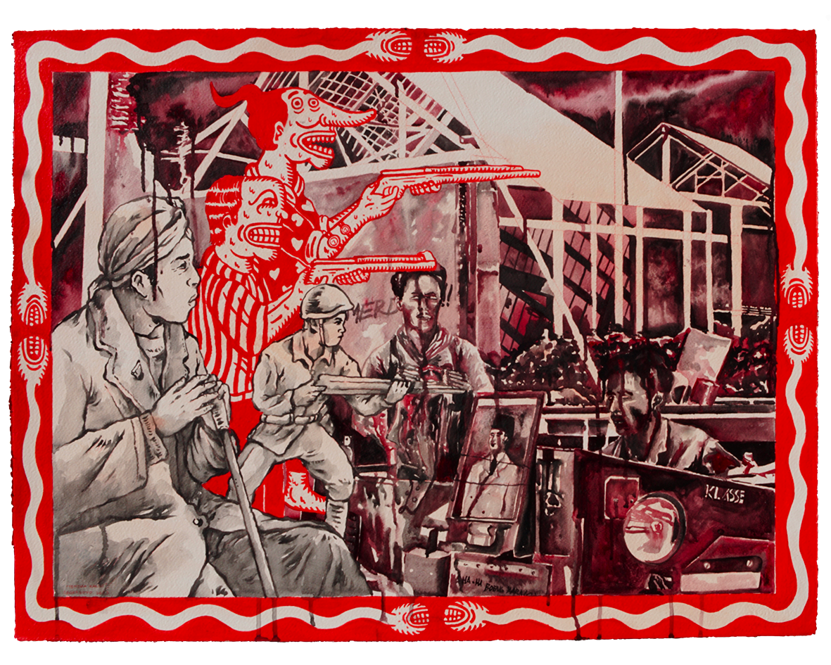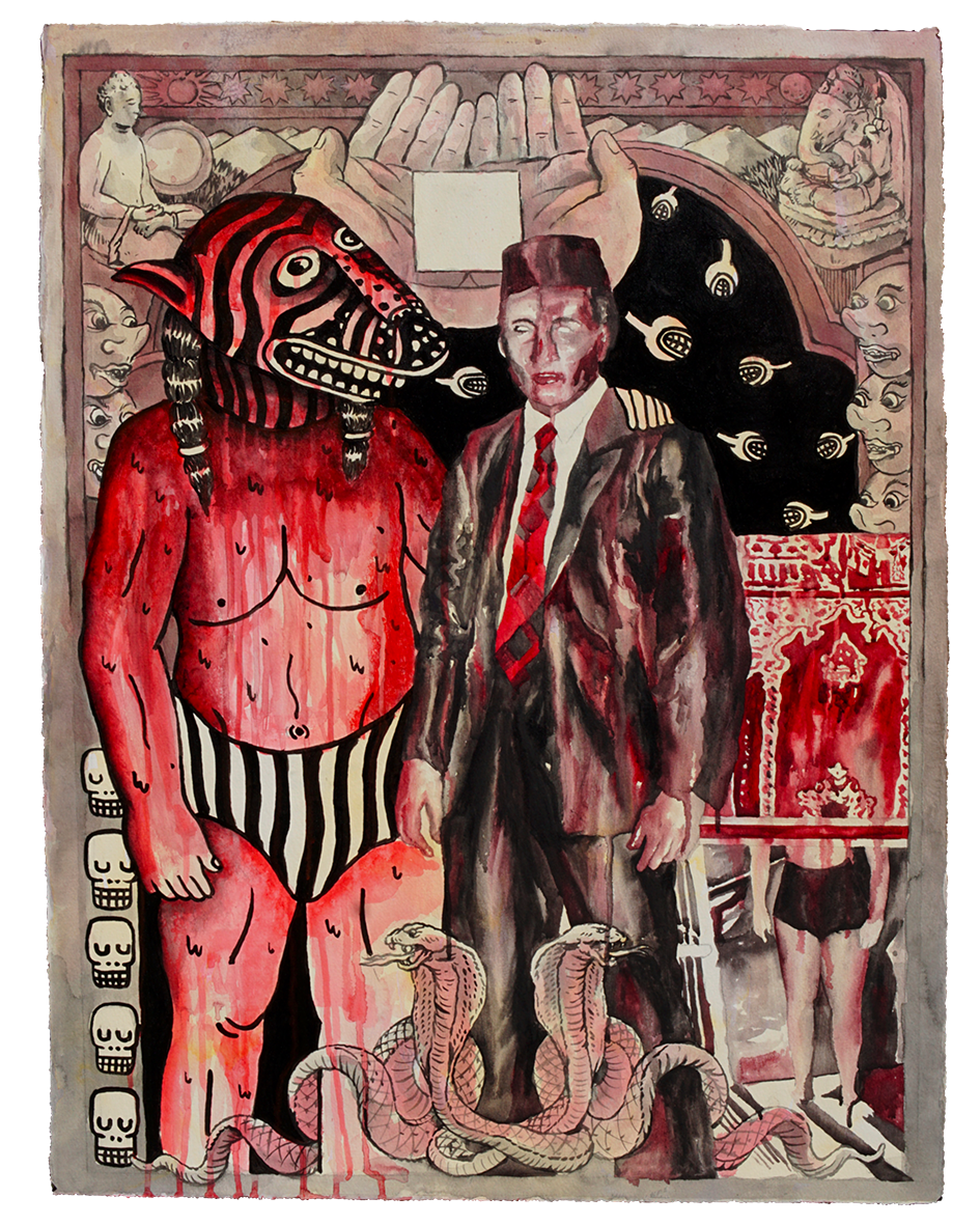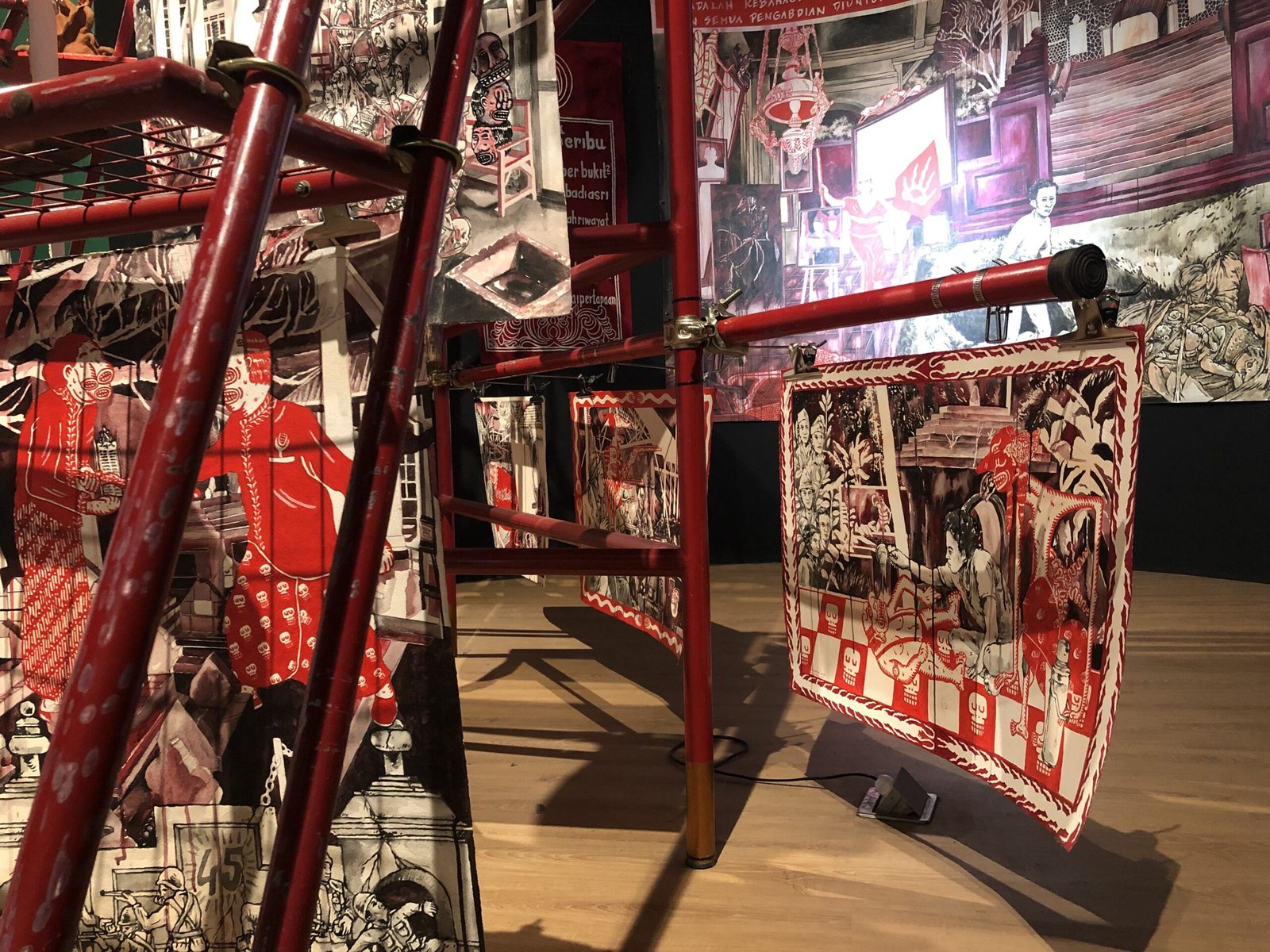 Painting on canvas and paper, shadow puppet mask, terracotta, silkscreen on fabric, found objects and steel installation